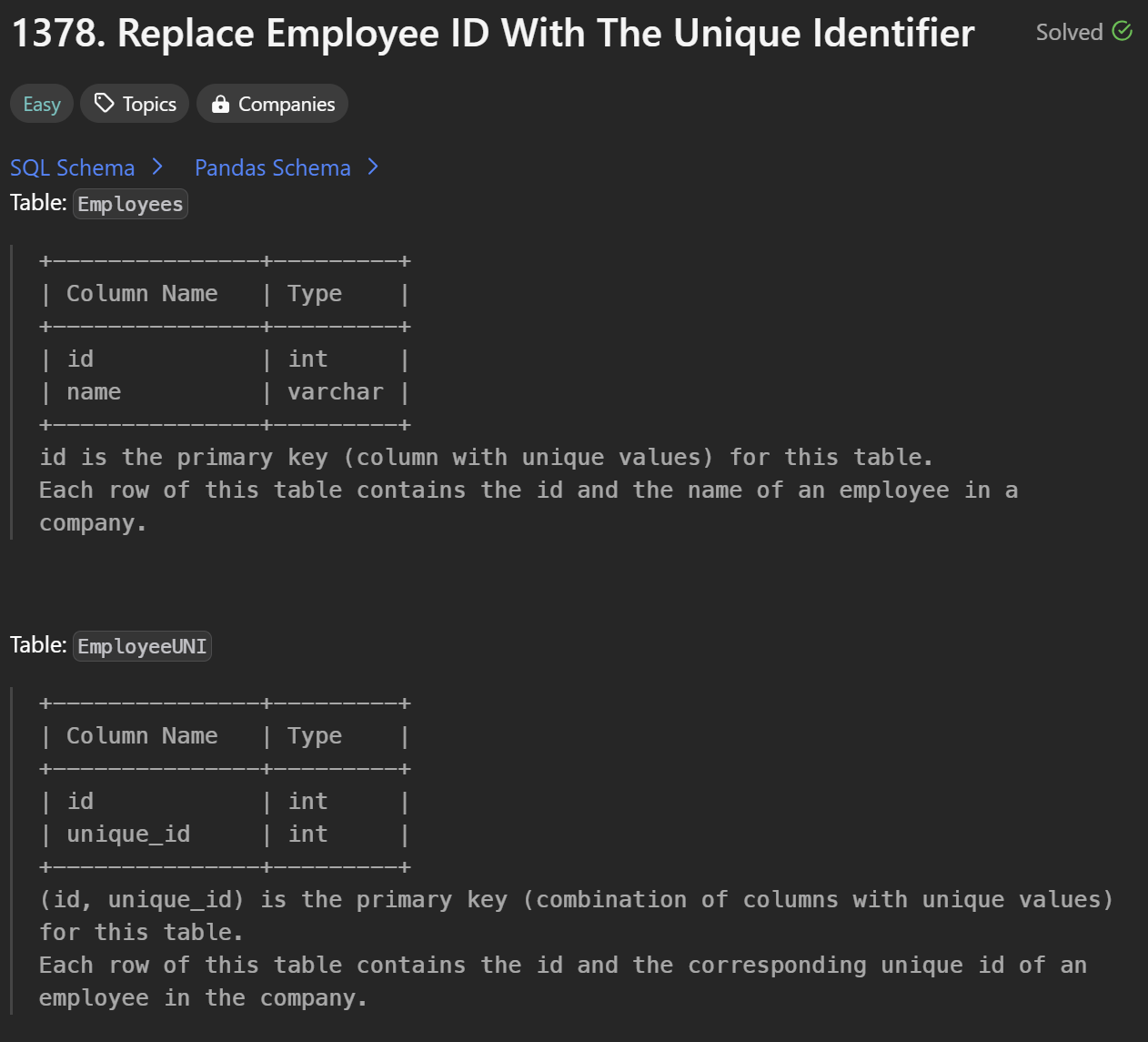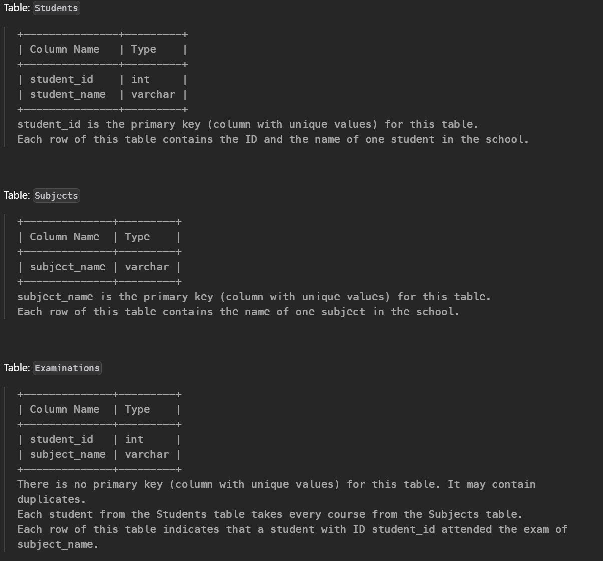 https://leetcode.com/problems/students-and-examinations/?envType=study-plan-v2&envId=top-sql-50🗒️SQL 코드 풀이 SELECT ST.student_id, ST.student_name, SB.subject_name, COUNT(EX.subject_name) AS attended_exams FROM Students ST CROSS JOIN Subjects SB LEFT JOIN Examinations EX ON ST.student_id = EX.student_id AND SB.subject_name = EX.subject_name GROUP BY ST.st..