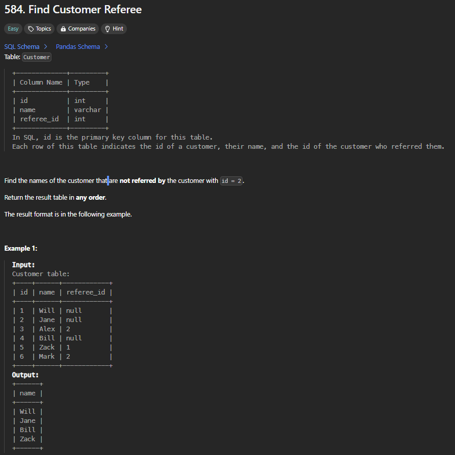 https://leetcode.com/problems/find-customer-referee/description/?envType=study-plan-v2&envId=top-sql-50🗒️SQL 코드 풀이 1SELECT nameFROM CustomerWHERE referee_id != 2 OR referee_id IS NULL 1. 간단한 SQL 문제이다. Customer 테이블에서 referee_id가 2가 아닌 값을 찾아냄 2. 주의점은 referee_id에 NULL 값이 있는데, 이거 같은 경우 값이 아니기 때문에 같은 연산자로 못 찾음 3. 때문에 IS NULL 과 같은 방법으로 찾는다. 🗒️SQL 코드 풀이 2SELECT nameFROM CustomerWHERE COALESCE(r..