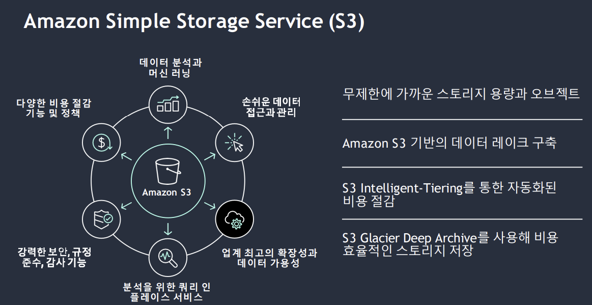 - 아카이브 및 장기 보관 → Glacier, Glacier Deep Archive.