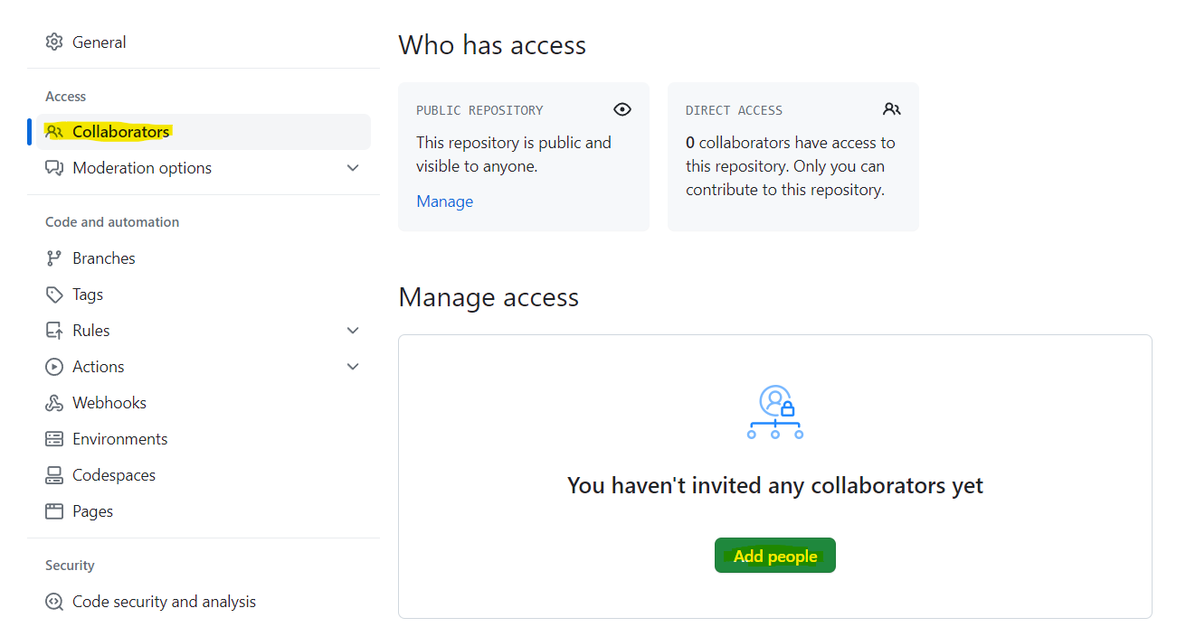 그리고 Collaborators -> Add people을 통해 협업 할 사람들을 초대한다.