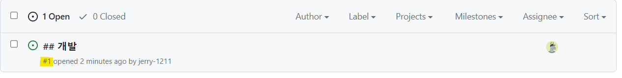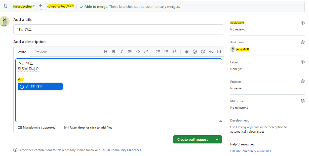 좀 전에 issue 했던 해쉬번호를 작성한다. (PR 완료되고 merge가 되면 issue 자동 삭제)