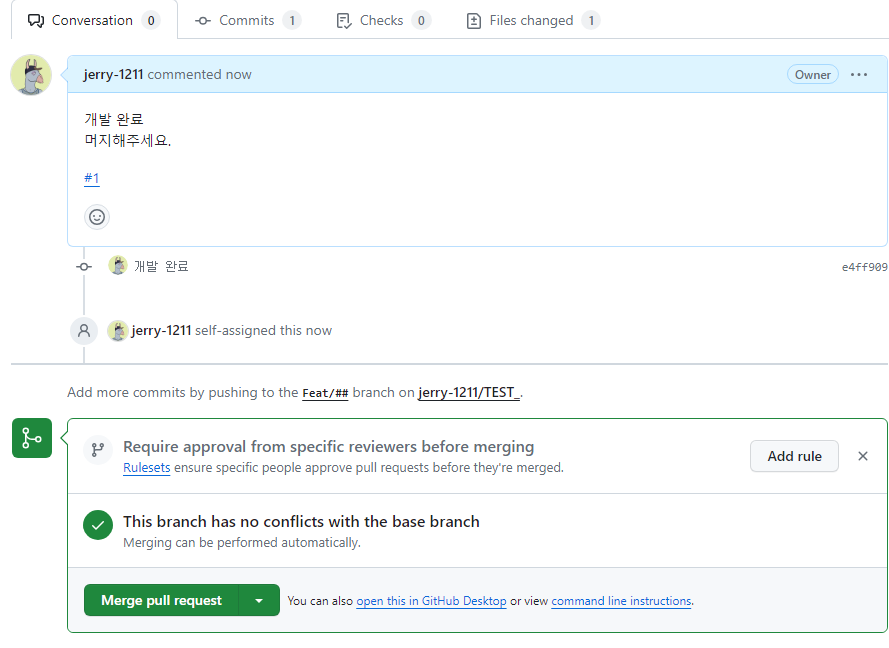 Merge pull request 버튼을 눌러 내가 최종 승인을 하면 되는 것이다 .