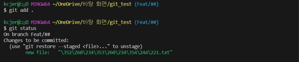 위에 개발이 되면 git add . / git status를 통해 스테이지에 올리고 확인한다.