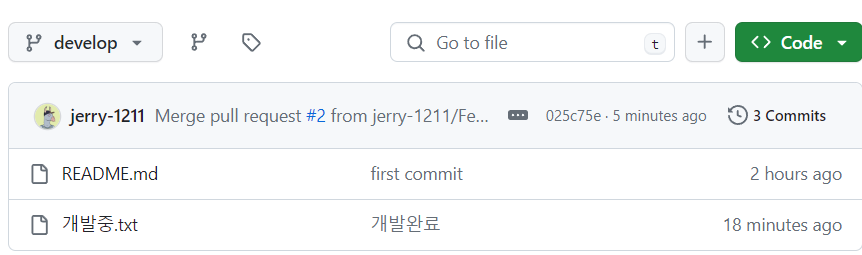 개발중.txt가 성공적으로 merge 된 것을 볼 수 있다.