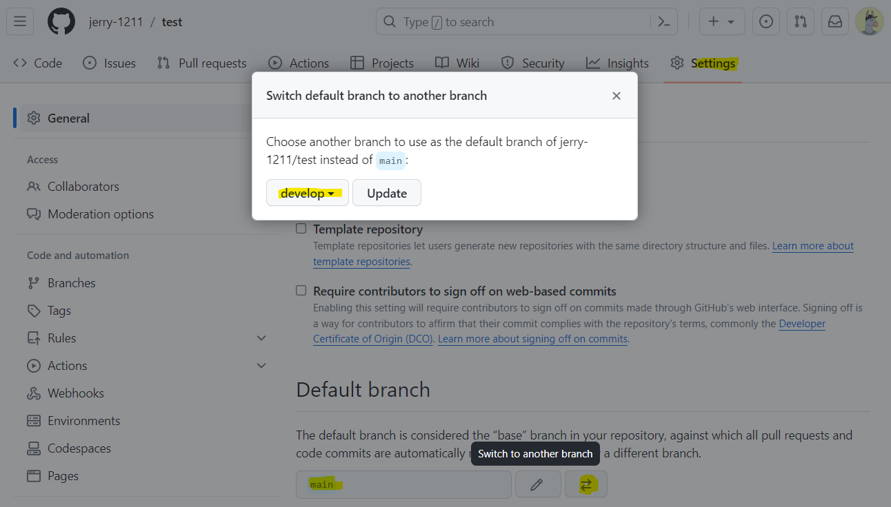 이후 setting -> Default branch -> develop에 들어간 후 Update를 클릭하면