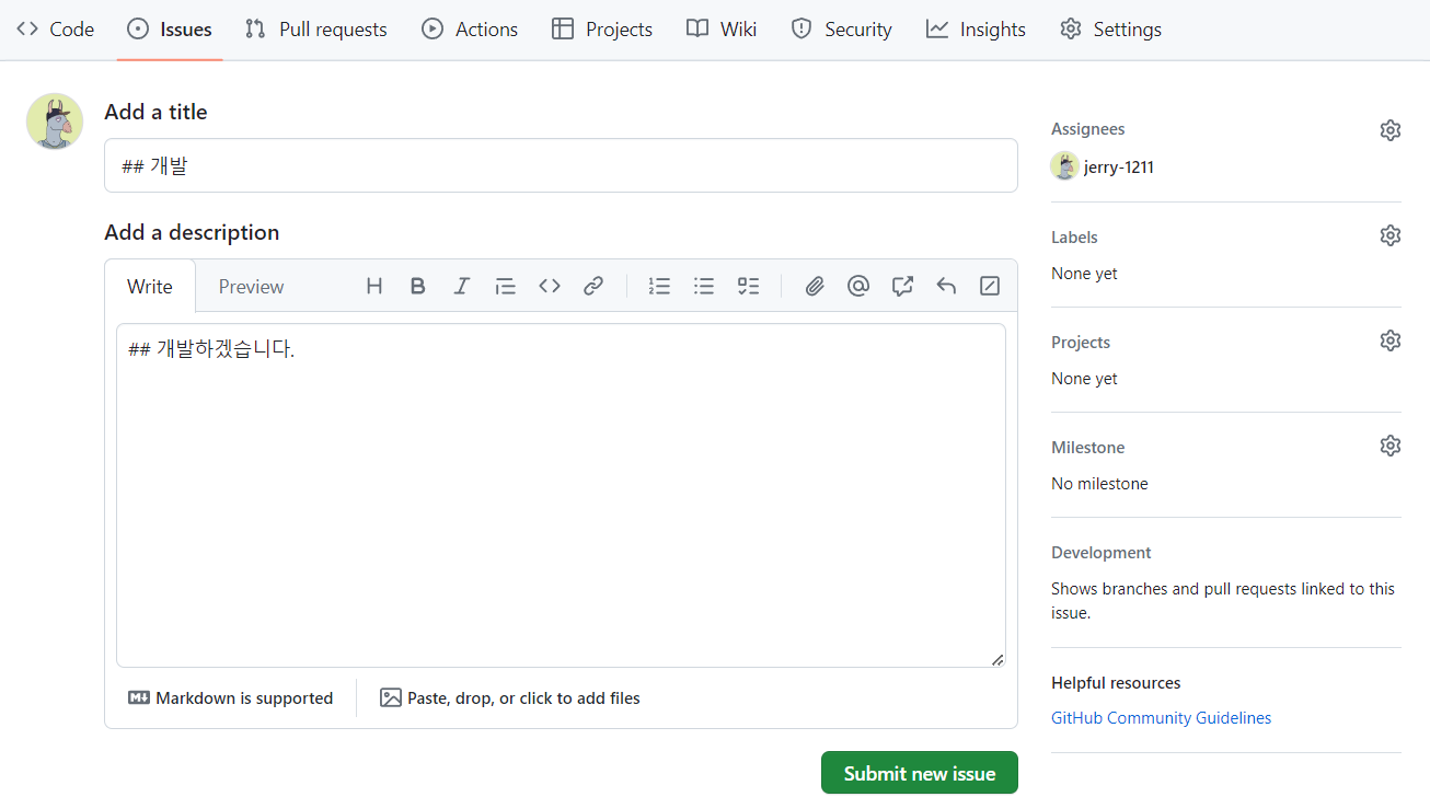 Issues -> New Issue를 통해 개발 할 것을 이슈 생성 한다.
