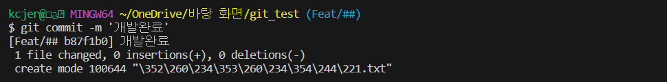 그리고 git commit -m '개발완료' 명령어로 로컬 저장소에 저장한다.
