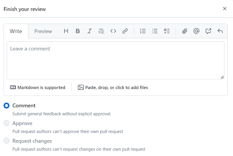 코드 리뷰가 완료되면 Finsish your review에 들어가 merge를 승인 할지를 정한다.