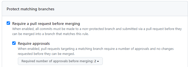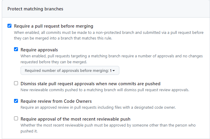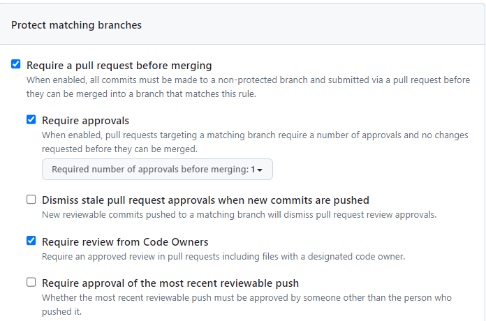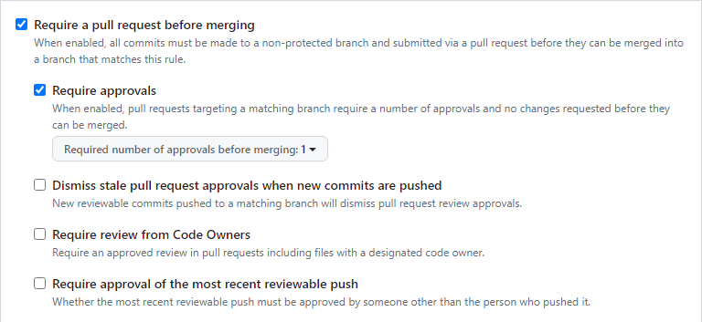 -> 체크 안하면 새로운 커밋 push 될 때마다 변경사항에 대한 승인이 강제되지 않음