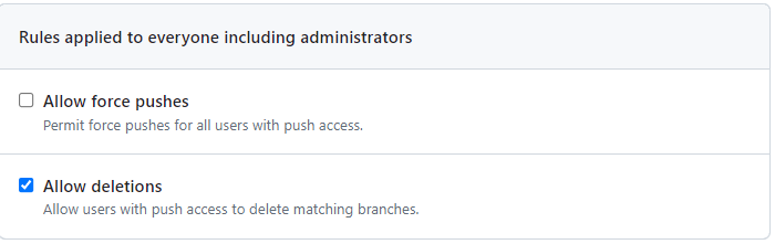 Allow deletions을 체크해야 PR 승인 후 코드 주인이 branch를 바로 지울수 있다.