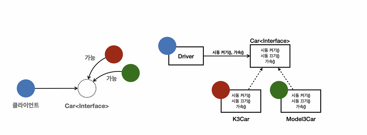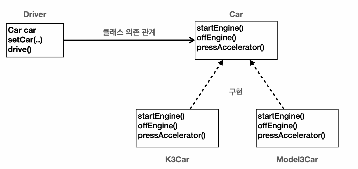 - Driver는 Car (역할)에만 의존하고, 구현인 K3, Model3 자동차에 의존하지 않음