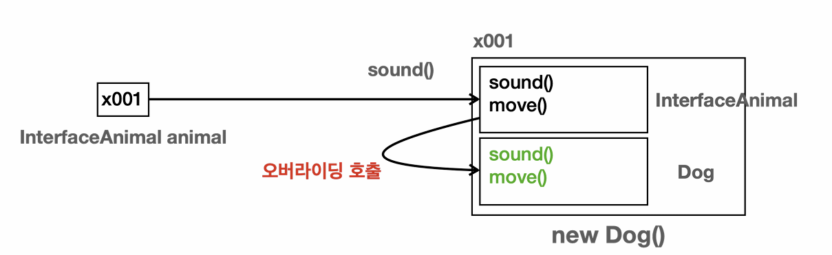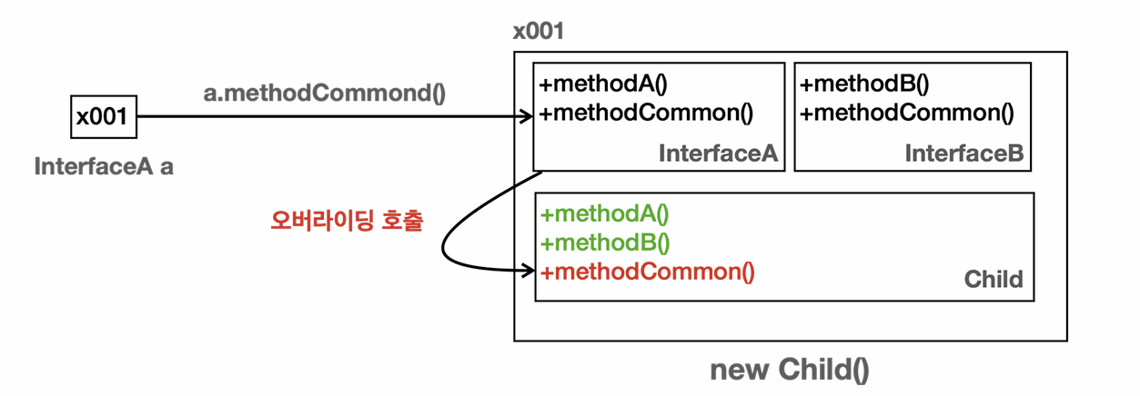 - 인터페이스는 모두 추상 메서드로 이뤄줘 있기 떄문에, 무조건 자식의 메서드 실행