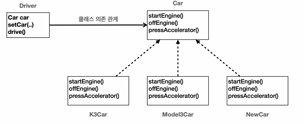 - Driver 클래스는 Car 인터페이스만 사용 (의존)