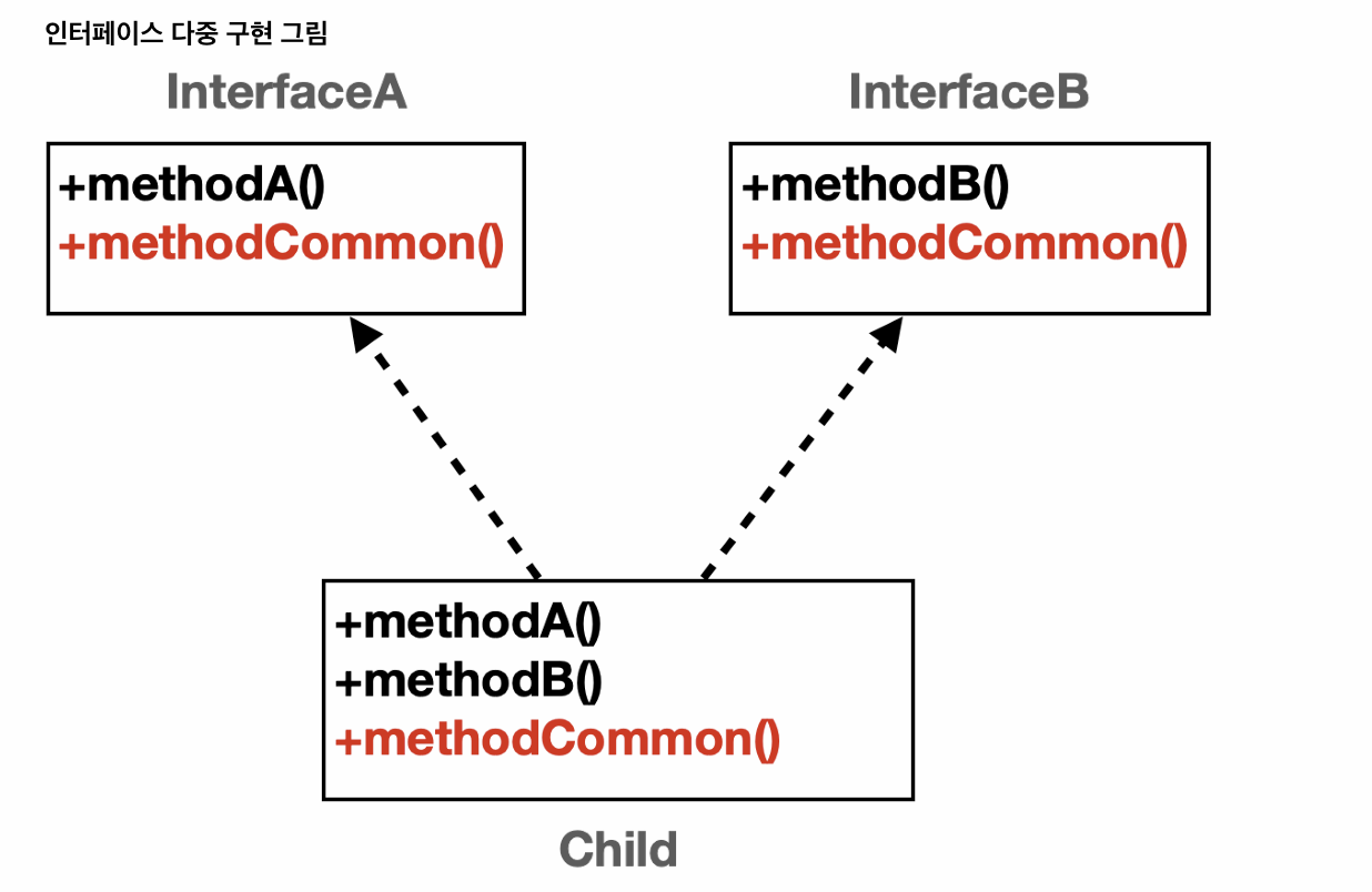 - 하지만 인터페이스는 부모를 여러명 두는 다중 구현 (다중 상속)이 가능