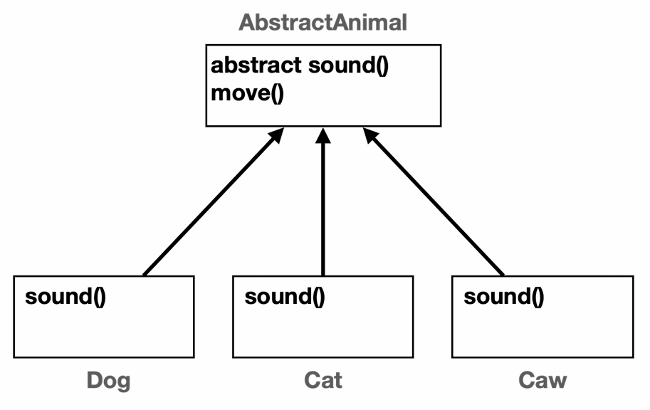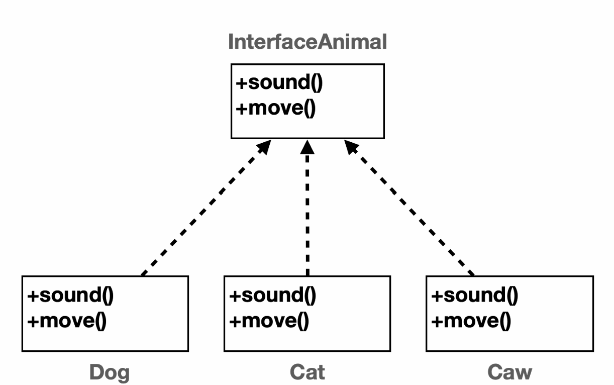 - 인터페이스는 매서드 이름만 있는 설계도로, 실제 작동하는 방법은 하위 클래스에서 구현한다.