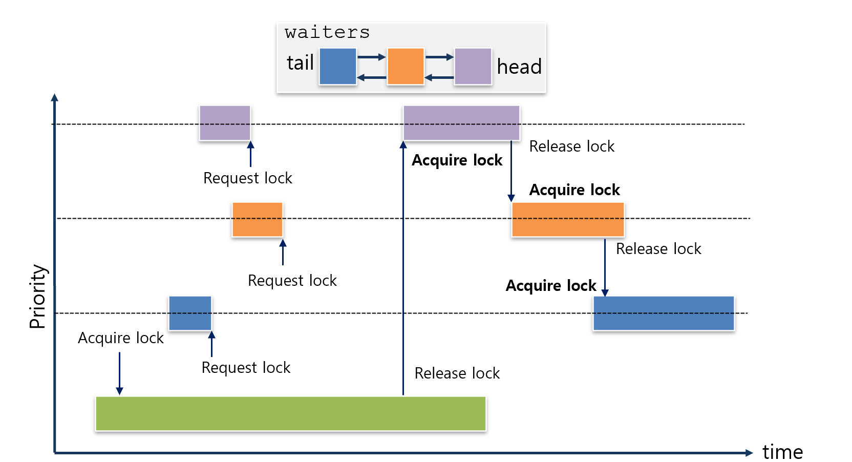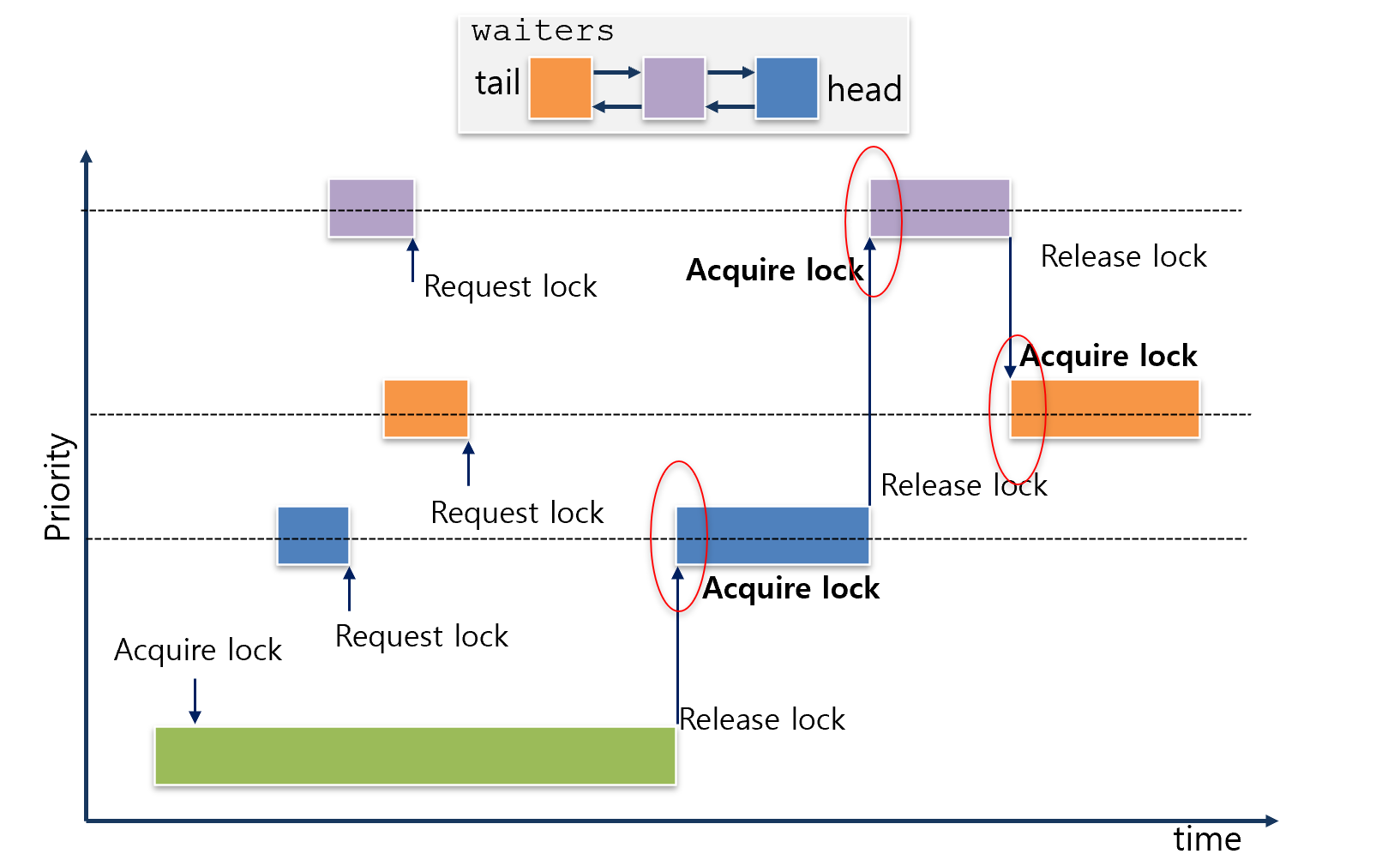- 스레드가 락,세마포어, 또는 조건 변수 기다릴 때도 우선순위 고려