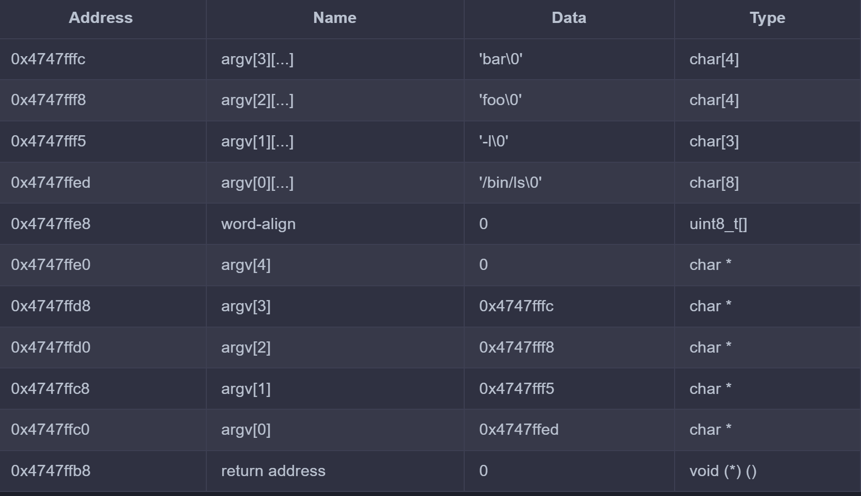 0x4747ffc0 0x00000000 NULL (종료 표시)