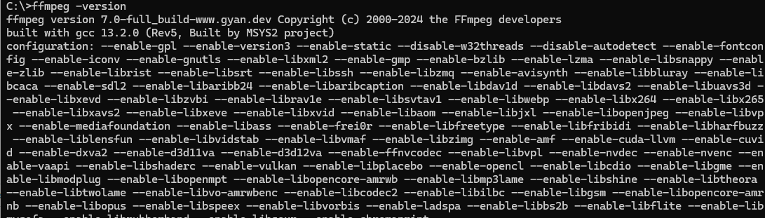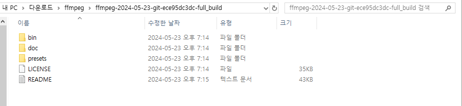 나는 "windows builds from gyan.dev" -> "ffmpeg-2024-05-20-git-127ded5078-full_build.7z"를 다운로드 받았다.