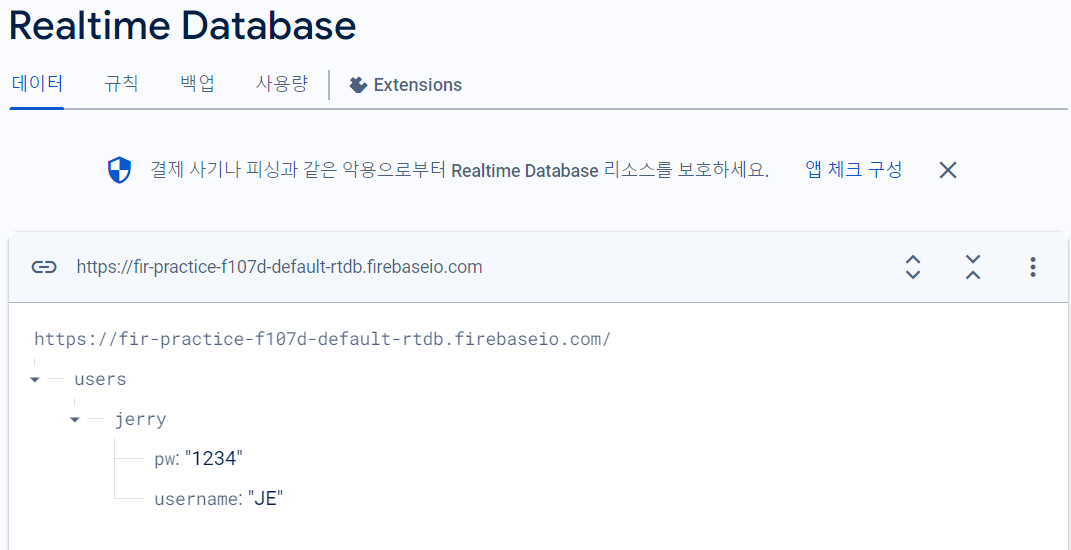firebase의 realtime database에 들어가보면, 잘 들어가진 것을 볼 수 있다.
