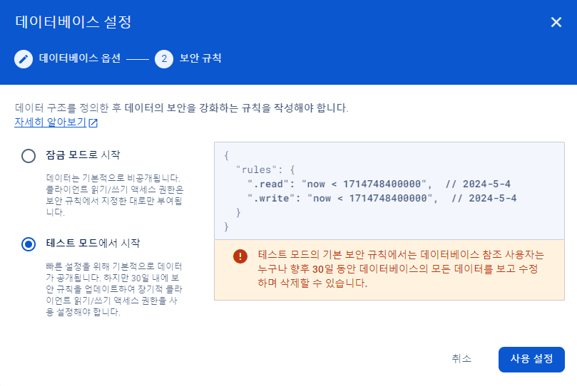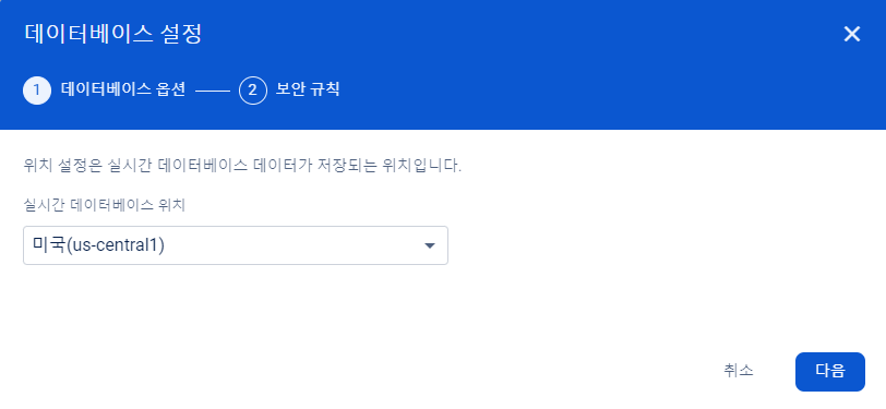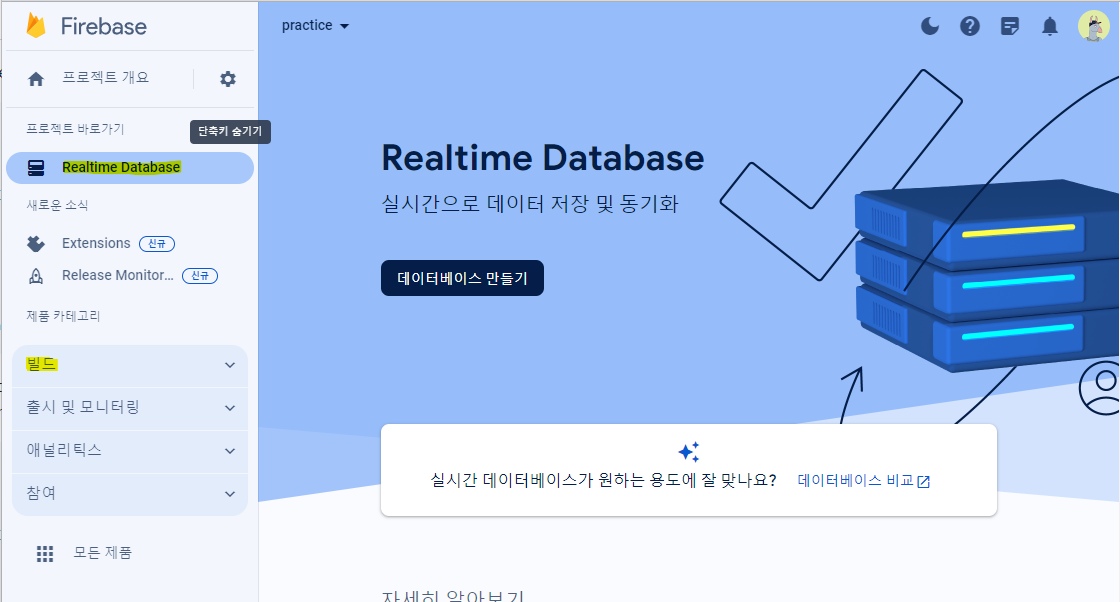 "빌드"에 들어가 "Realtime Database"를 클릭면 다음과 같은 창이 뜬다.