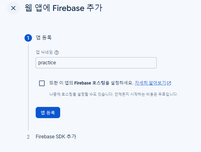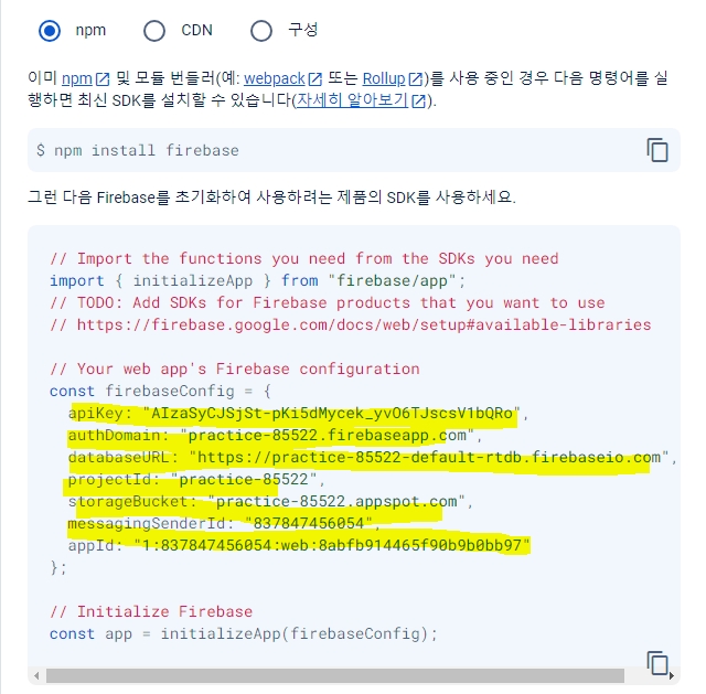 그러면 아래와 같이 Firebase SDK 추가 할 수 있는 코드를 준다.