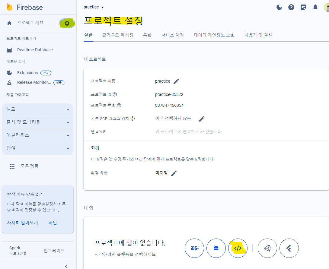 그리고 페이지 아래 "내 앱" 쪽 "</>" (웹 앱에 firebase 추가) 부분을 눌러준다.